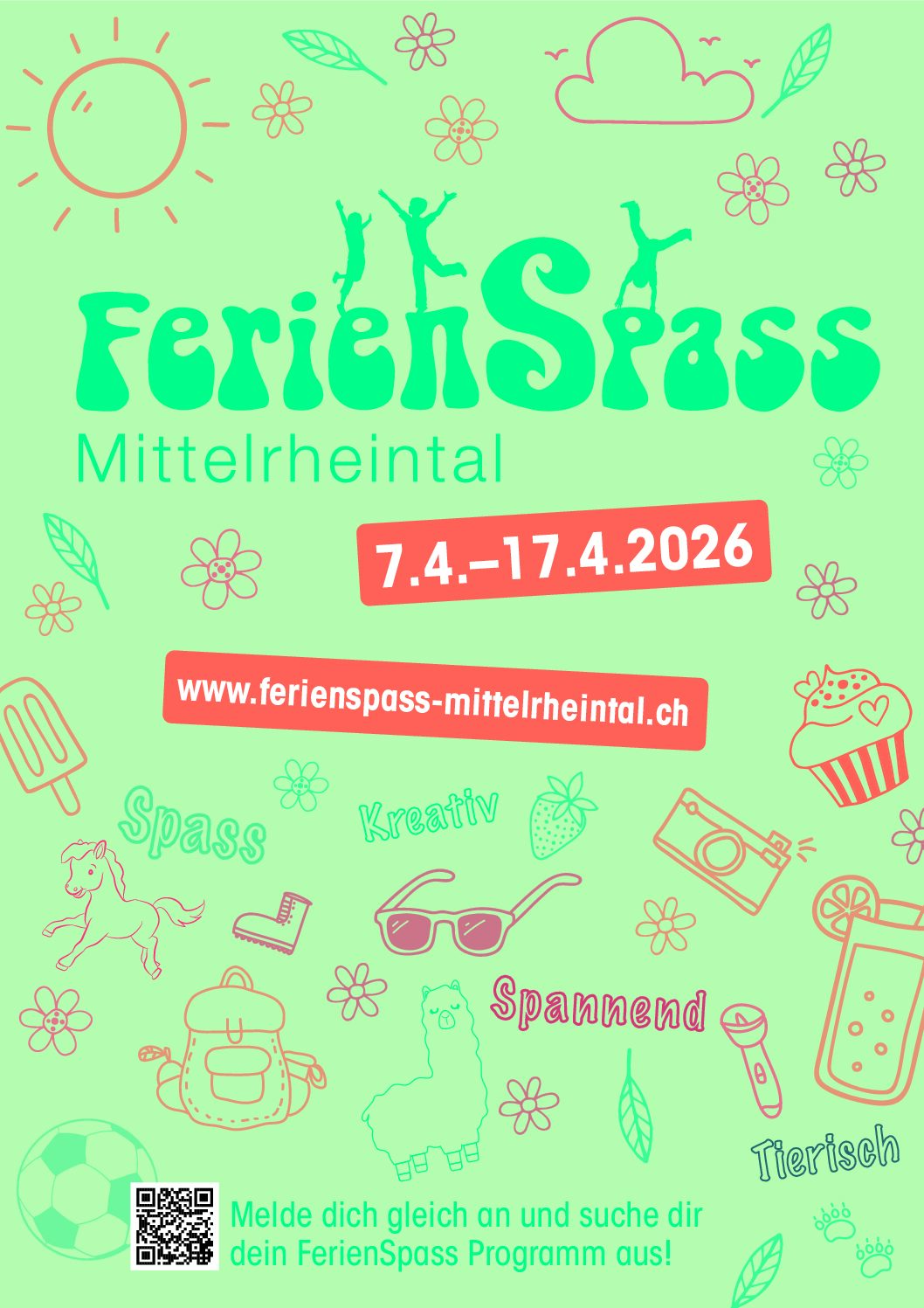 Für die Teilnahme braucht es eine Registrierung auf der Internetseite vom FerienSpass Mittelrheintal, damit eine Anmeldung zu den einzelnen Veranstaltungen möglich ist. Alle Informationen dazu und diverse tolle Ferienaktionen findet ihr auf der Homepage vom FerienSpass Mittelrheintal. Das SDM-JNW beteiligt sich, grösstenteils unter Mitwirkung von Jugendlichen, mit folgenden Anlässen: